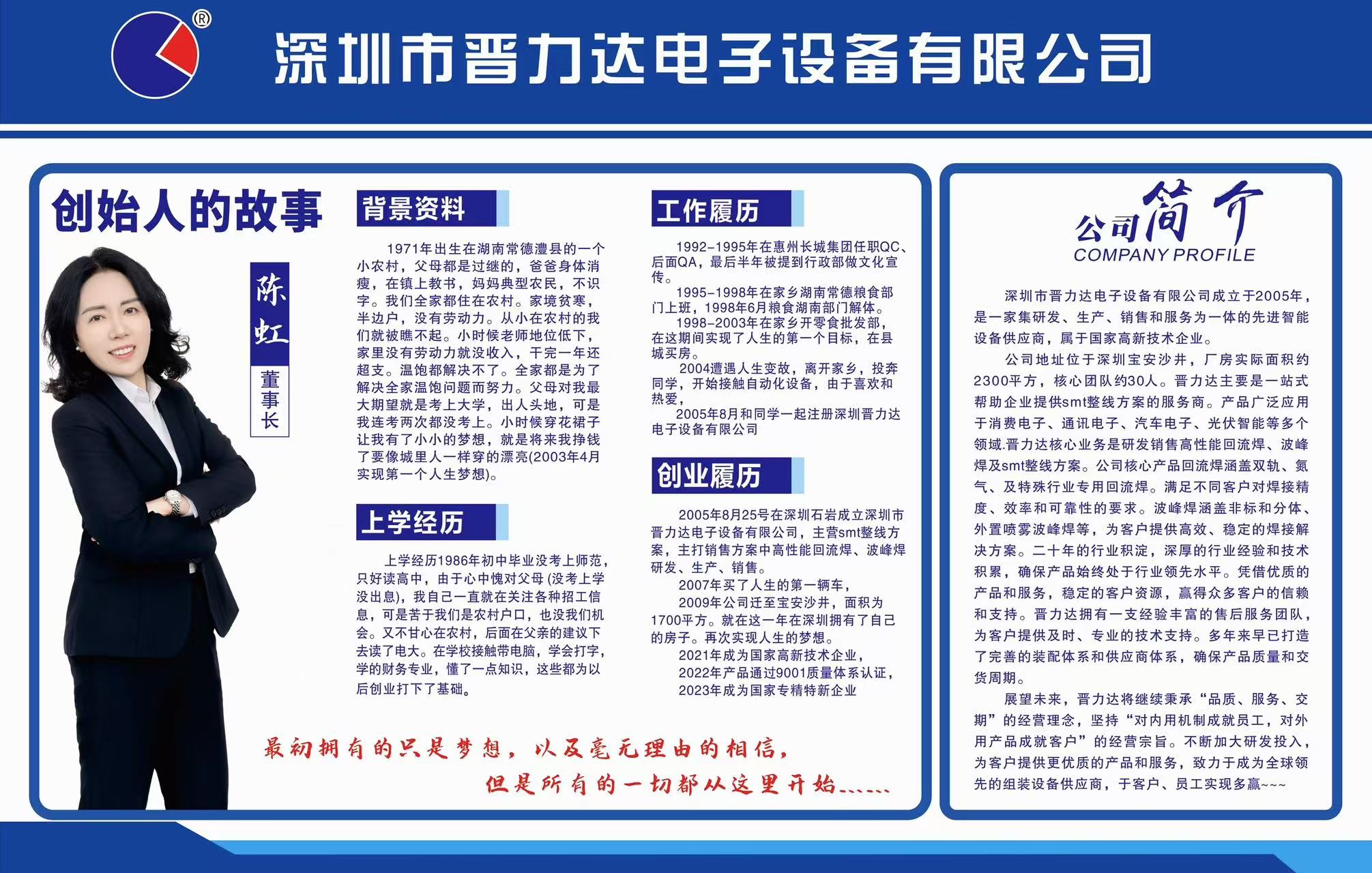 深圳市晉力達電子設備有限公司成立于2005年,主要從事高性能環保無鉛回流焊、無鉛波峰焊SMT等周邊設備的研制開發、生產銷售為一體的專業流水線配套生產設備企業。優良的產品質量和 先進的技術使我們與客戶們建立了良好的關系,并讓我們在同行業中擁有良好的聲譽。遵循“誠信、務實、精益、創新、環保”的企業文化,堅持以技術差異化創造 市場機會,秉承以高技術、高品質、優服務為宗旨,堅持國際化、標準化、專業化的方針,我們將為您提供優質的設備和優良的服務。我們倡導誠信變通、簡單、高 效、樂觀敬業的激情創業文化,我們致力于用技術為客戶提供更好的體驗和服務,與客戶員工共同成長,實現多贏!