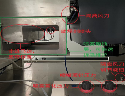 1、每日下班前噴頭需要用酒精噴3-5分鐘,具體操作(需關(guān)閉預(yù)熱箱再操作):關(guān)閉助焊劑球閥,打開酒精閥,點(diǎn)擊噴霧手動(dòng)(觸摸屏款)或設(shè)置一連續(xù)噴霧(電腦款),第二天上班請(qǐng)關(guān)閉酒精閥,噴干凈管道內(nèi)殘留的酒精,再打開助焊劑閥,待再噴霧半分鐘至管道內(nèi)殘留酒精噴干凈可正常工作。