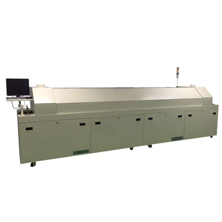 大型雙軌回流焊主要包括電源、傳動電機、空氣電機、加熱器、報警器、雙風冷快冷結構、主機控制系統、計算機操作系統等,每個系統都有一定的要求。雙軌獨立運輸使兩種不同類型的產品同時在雙軌上回流,生產效率翻倍;優質高溫高速電機,空氣傳輸穩定,振動小,噪音低;專業風輪設計,風速穩定,有效防止PCB板加熱時風的均勻性,實現最高的重復加熱;獨立控制冷卻系統,進口不銹鋼,冷卻上下對流,冷卻后曲線與焊接溫度曲線一致,完全符合SMT國際標準認證標準。節能十溫區回流焊。